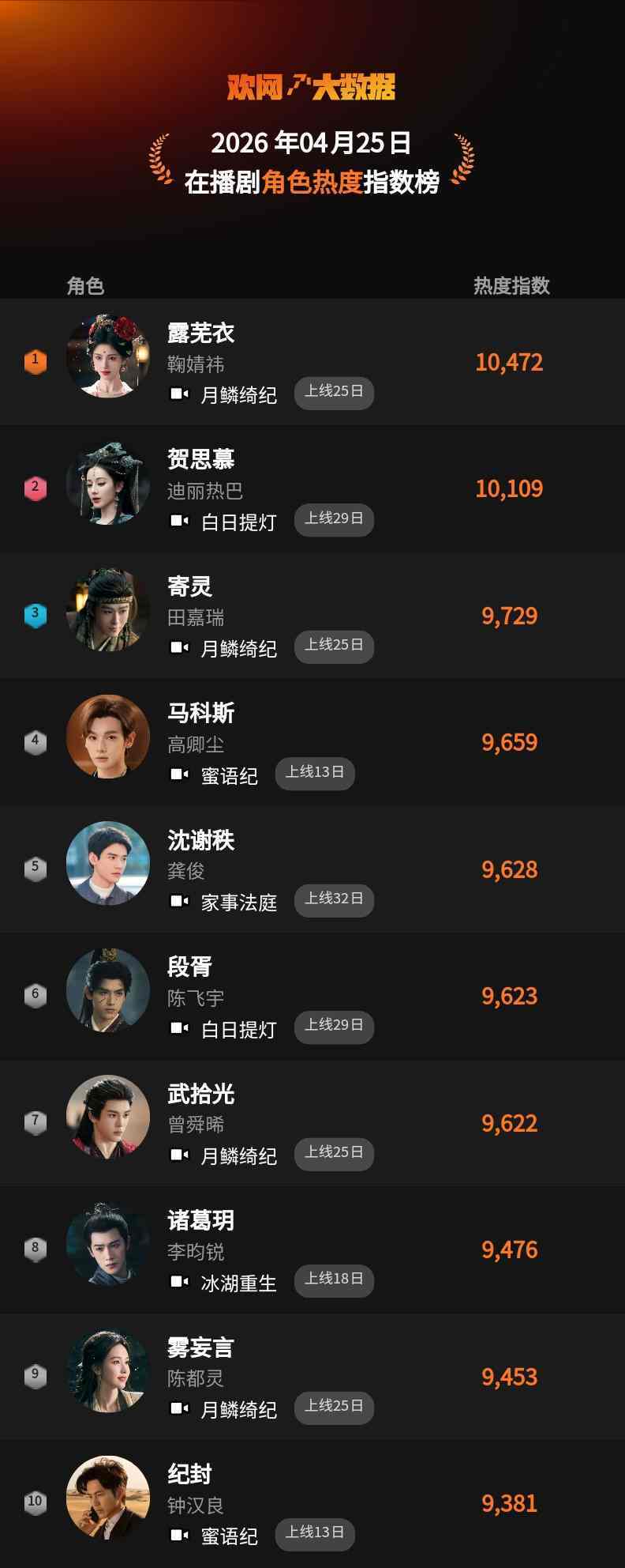 4月25日 欢网大数据【在播剧】角色热度指数TOP10来啦!