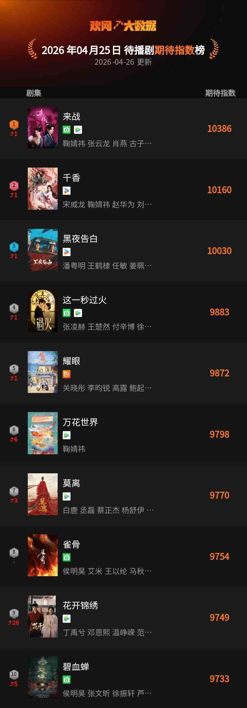 4月25日 欢网大数据【待播剧】期待指数TOP10来了!