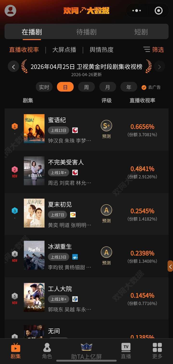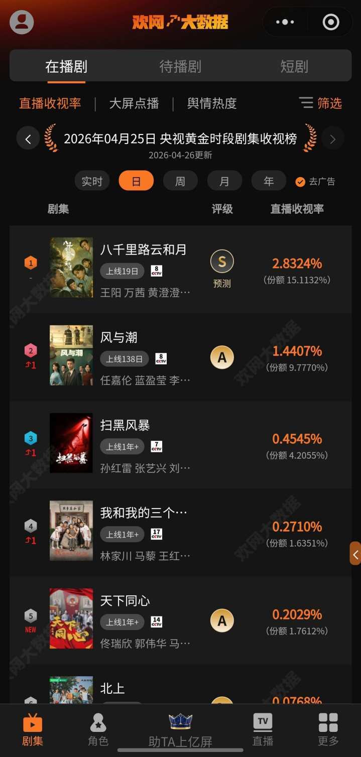 4月25日 欢网大数据【央视黄金时段】剧集直播收视率来啦!