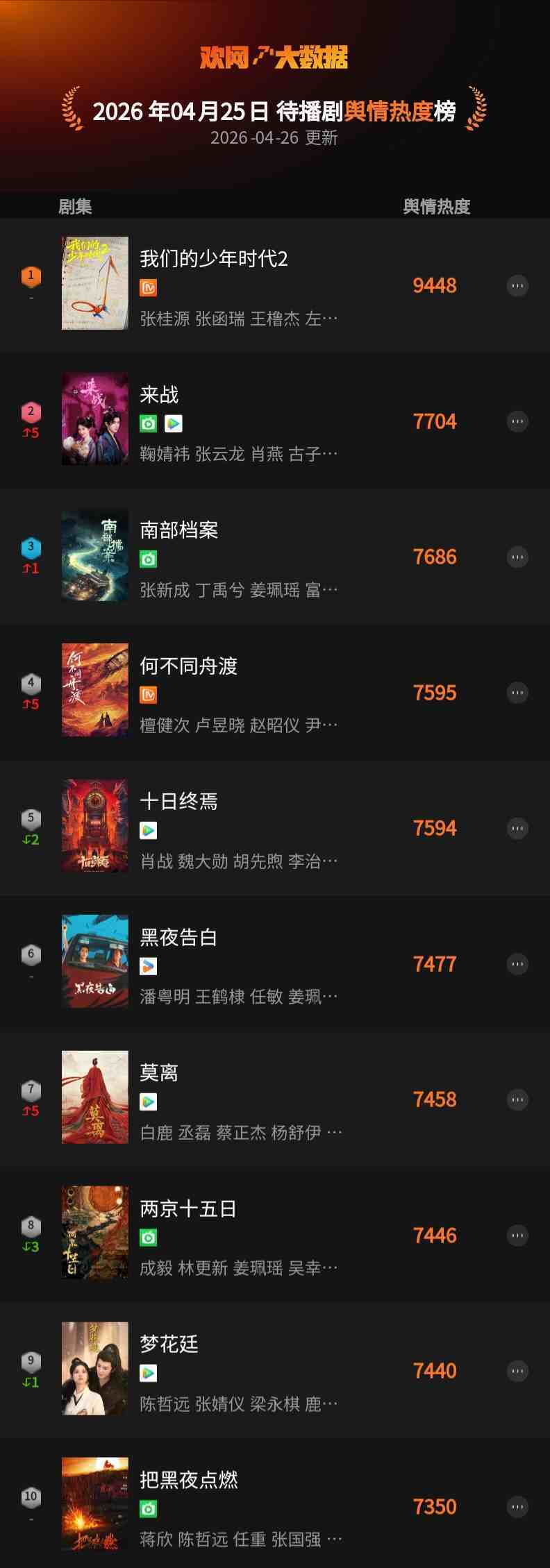 4月25日 欢网大数据【待播剧】舆情热度TOP10来了!