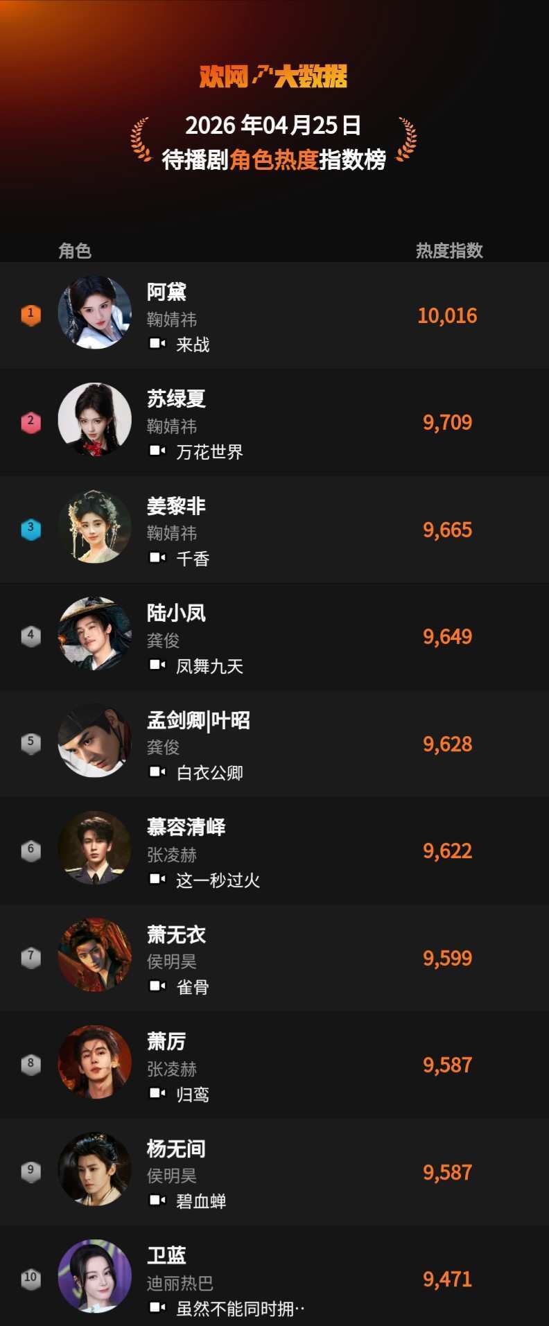 4月25日 欢网大数据【待播剧】角色热度指数TOP10来啦!