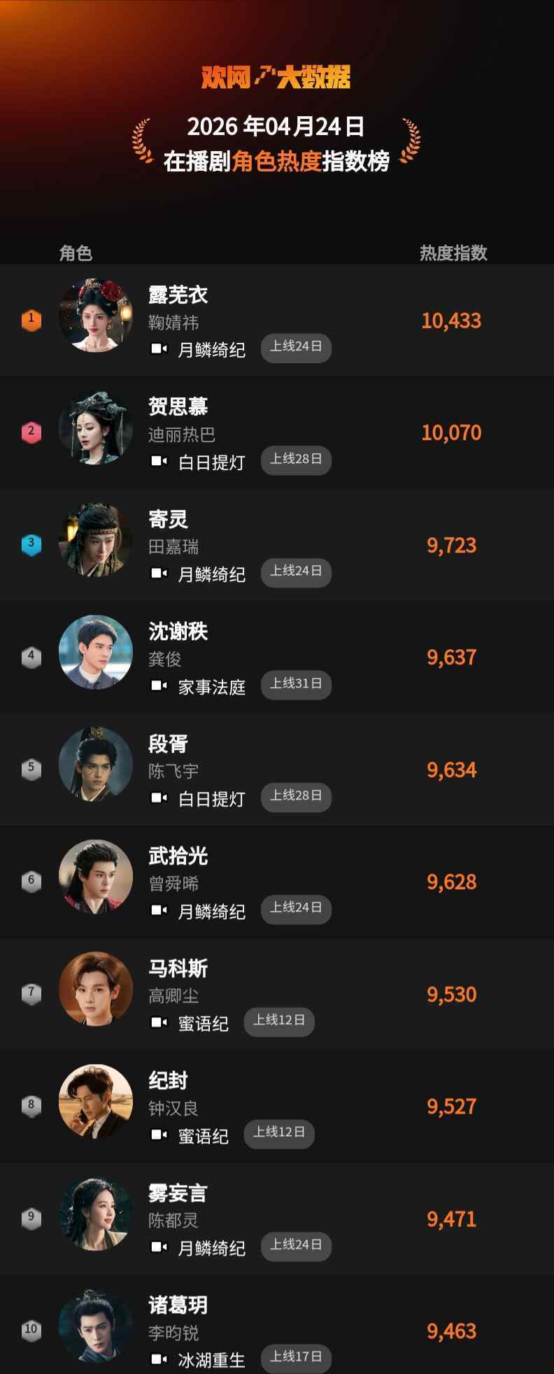 4月24日 欢网大数据【在播剧】角色热度指数TOP10来啦!