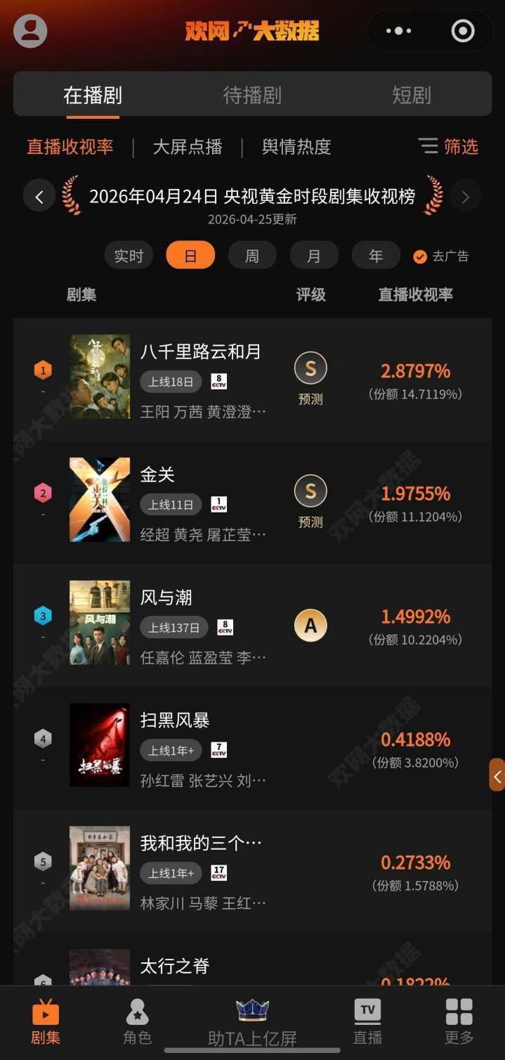 4月24日 欢网大数据【央视黄金时段】剧集直播收视率来啦!