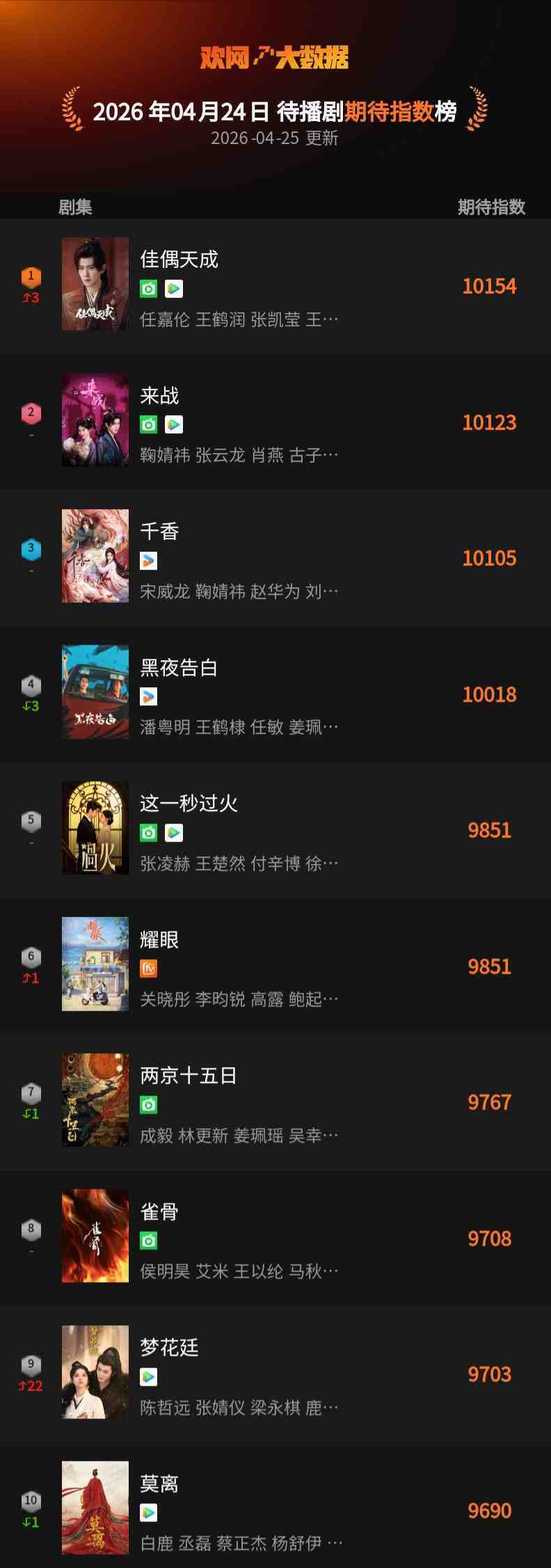 4月24日 欢网大数据【待播剧】期待指数TOP10来了!