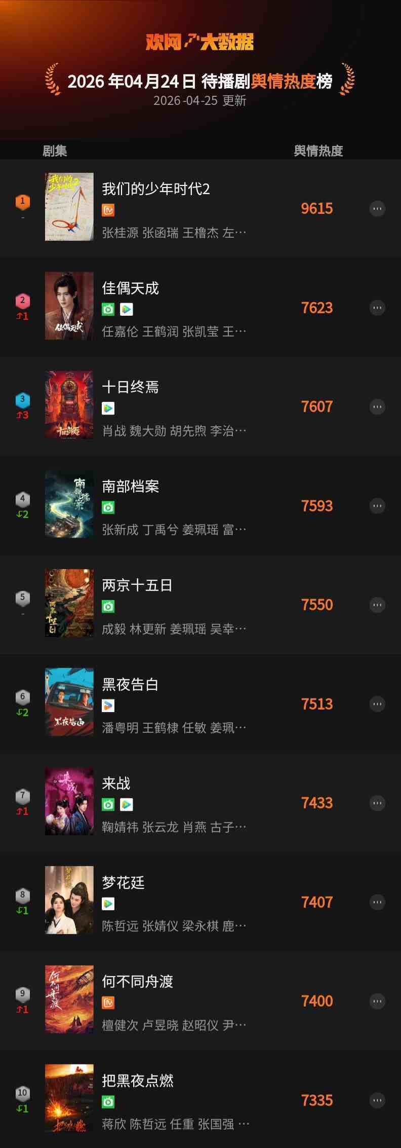 4月24日 欢网大数据【待播剧】舆情热度TOP10来了!