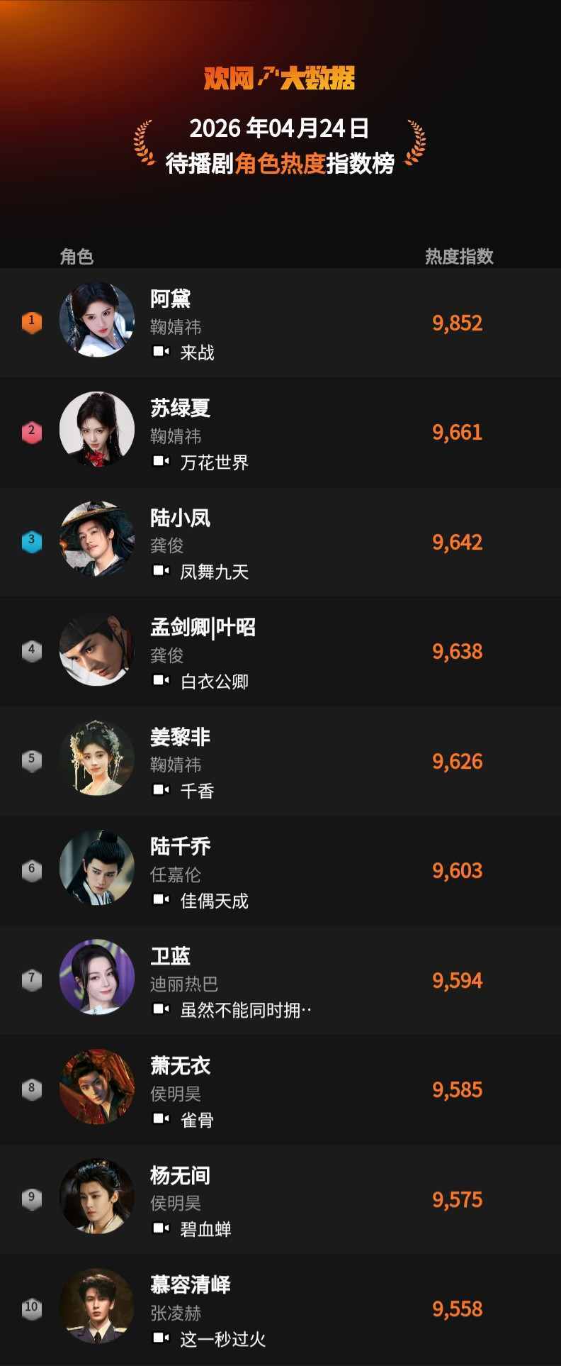 4月24日 欢网大数据【待播剧】角色热度指数TOP10来啦!