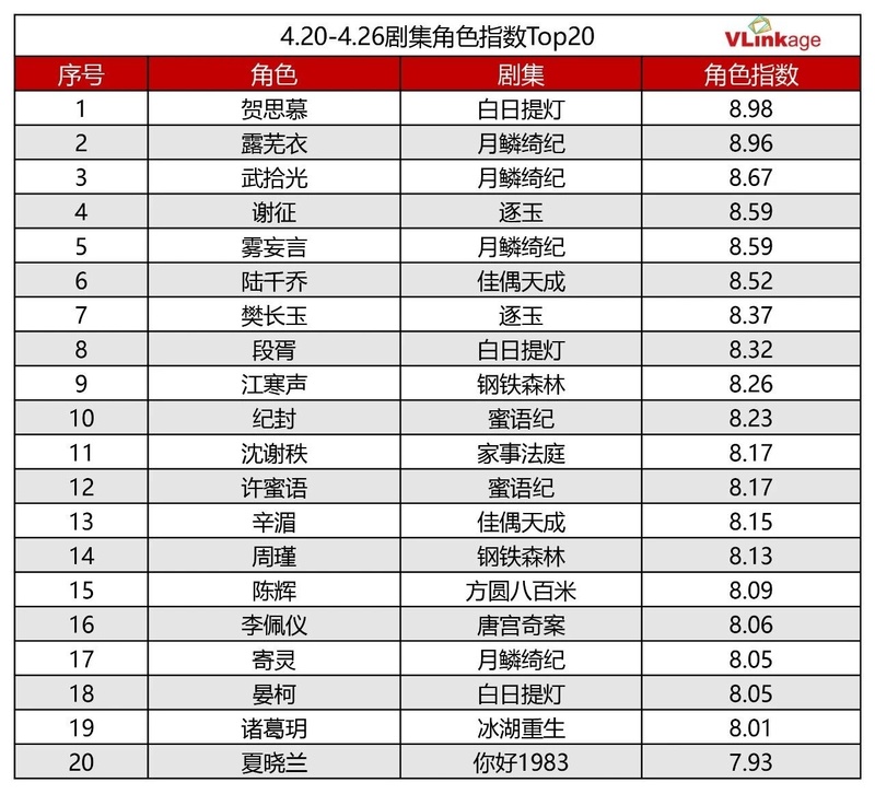 下图为上周剧集角色指数Top20,受众关注度最高的角色分别为《白日提灯》女主贺思慕和《月鳞绮纪》女主露芜衣。这两位来自古偶剧的女主,在剧集收官后依然在剧迷里有着高认知度。