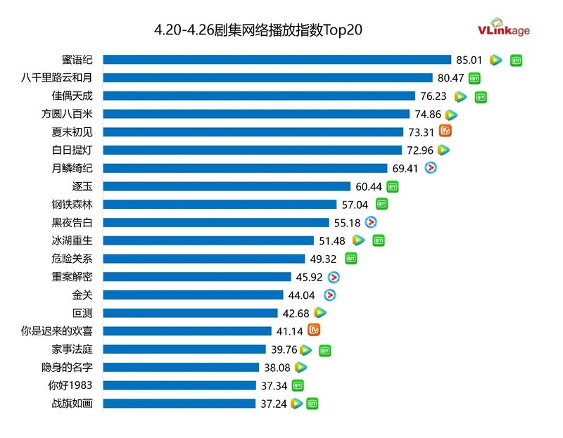 下图为上周剧集网播指数Top20,热度最高的作品为都市情感剧《蜜语纪》,该剧开播后热度一路逆袭并持续保持85+高位,是今年4月的黑马之作。抗战剧《八千里路云和月》同样热度表现优异,上周网播指数在80+量级。