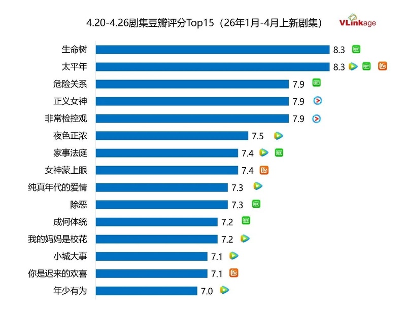 下图为今年剧集上周豆瓣评分Top15,上榜作品口碑表现和上上周一致。