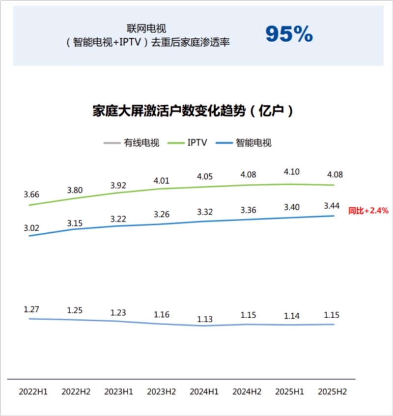 大屏已成为国民级的媒介入口。2025年,我国智能电视激活用户规模持续增长,联网电视家庭渗透率高达95%。