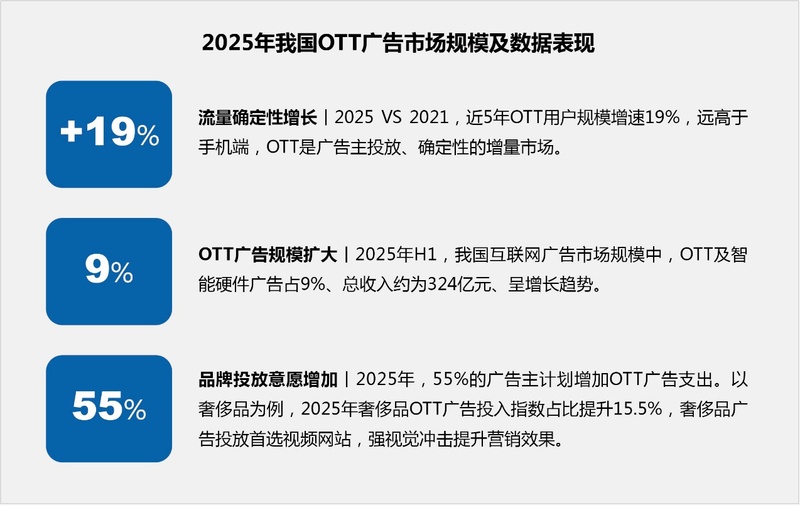 市场信心强劲。2025年,55%的广告主计划增加OTT广告支出。OTT用户规模近5年的增速达19%,远高于手机端,已成为品牌寻求确定性增量的蓝海媒介。