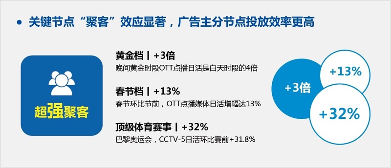 重大赛事、节日期间快速聚集关注度。黄金档及重大节日(如春节、顶级体育赛事)期间,大屏快速吸引观众的注意力。巴黎奥运会期间,CCTV-5日活环比增长达32%,是引爆品牌声量的不可替代入口。