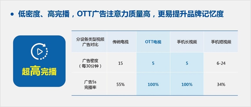 高效率与广告记忆度。对比传统电视与手机端,OTT视频广告拥有极高的注意力质量。OTT电视广告的5秒完播率可达100%,远高于手机短视频的34%。低广告密度与沉浸式体验,显著提升了品牌记忆度。