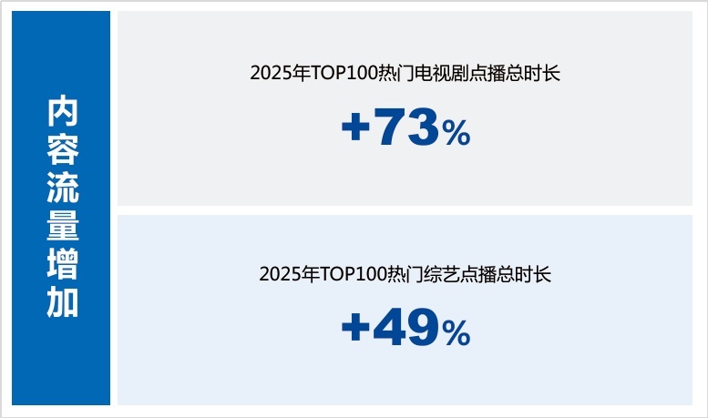 观众观看时长提升。智能电视端,2025年热门电视剧和综艺的点播总时长分别增长了73%和49%。用户对大屏深度观看的行为显著增强,为品牌叙事提供了高质量的注意力资源。