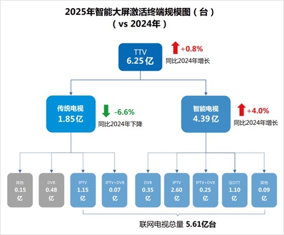 设备终端规模持续扩大。2025年智能电视终端规模相比2024年(4.22亿台)增长了4%,达4.39亿台。