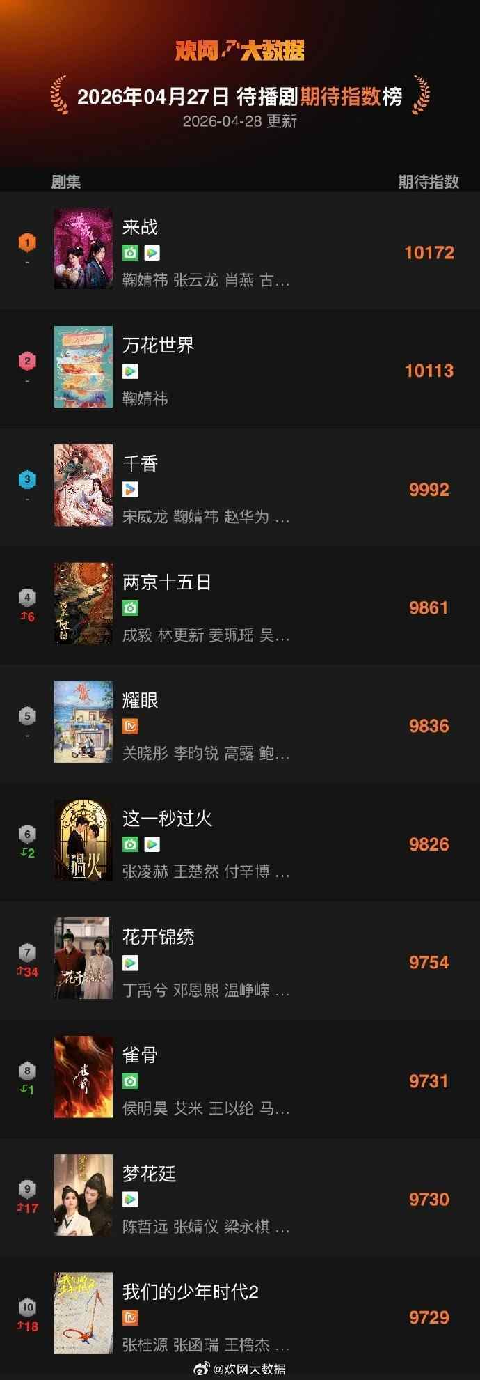 4月27日 欢网大数据【待播剧】期待指数TOP10来了!