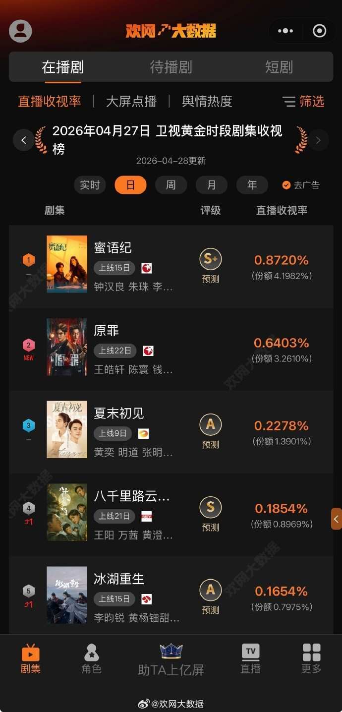 4月27日 欢网大数据【卫视黄金时段】剧集直播收视率来啦!