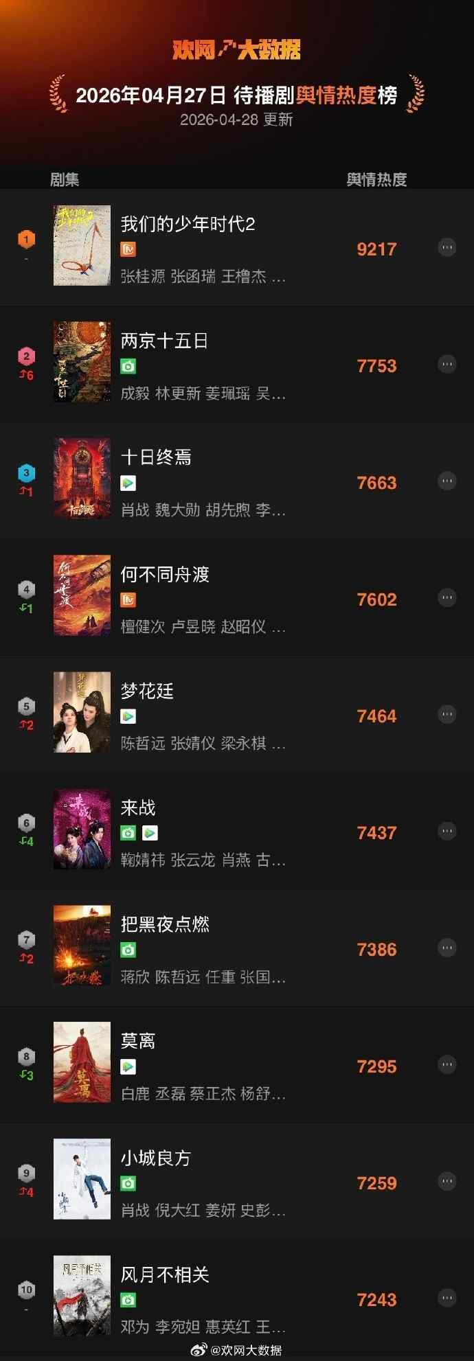 4月27日 欢网大数据【待播剧】舆情热度TOP10来了!