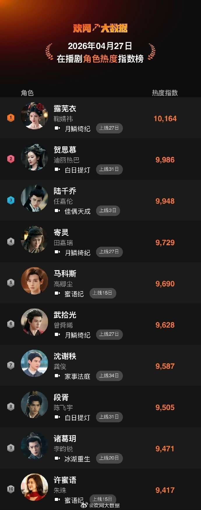 4月27日 欢网大数据【在播剧】角色热度指数TOP10来啦!