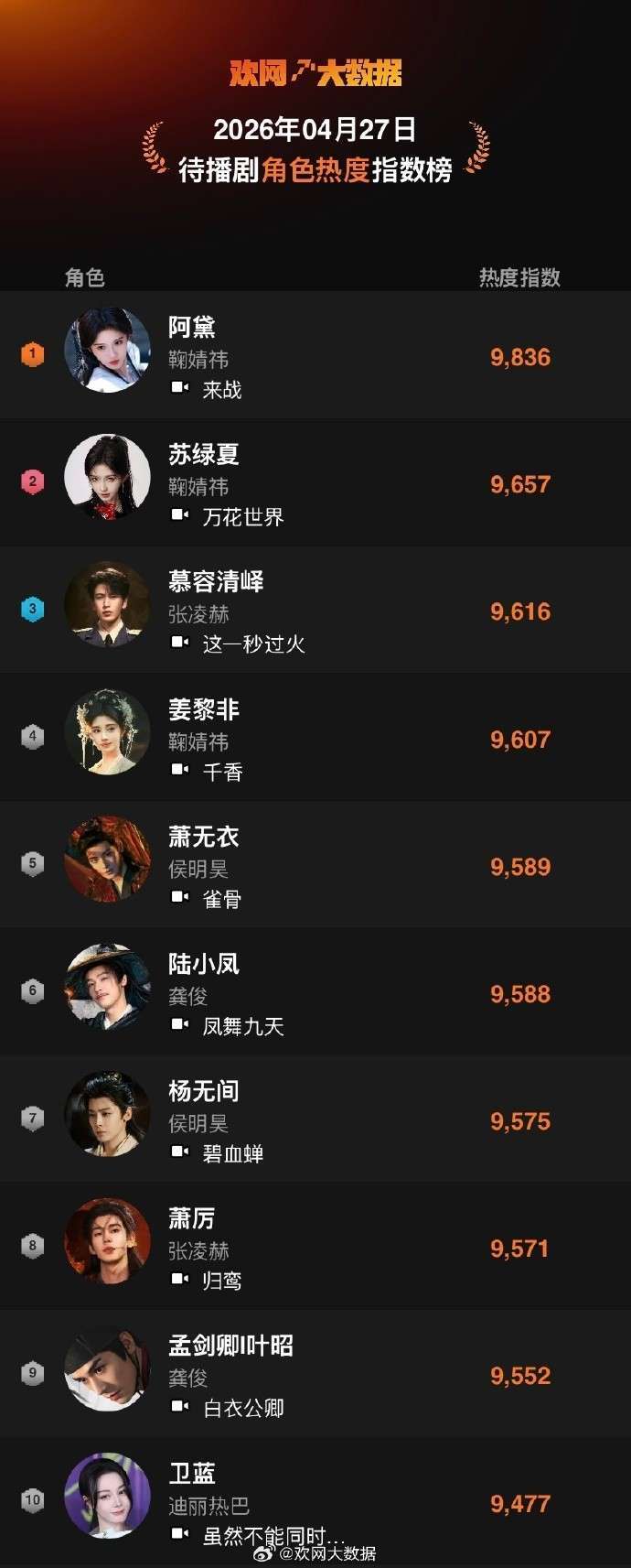 4月27日 欢网大数据【待播剧】角色热度指数TOP10来啦!