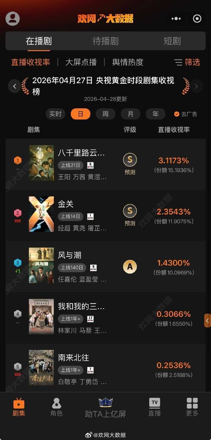 4月27日 欢网大数据【央视黄金时段】剧集直播收视率来啦!
