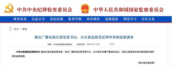 据湖北省纪委监委消息:湖北广播电视台原党委书记、台长郭忠涉嫌严重违纪违法,目前正接受湖北省纪委监委纪律审查和监察调查。