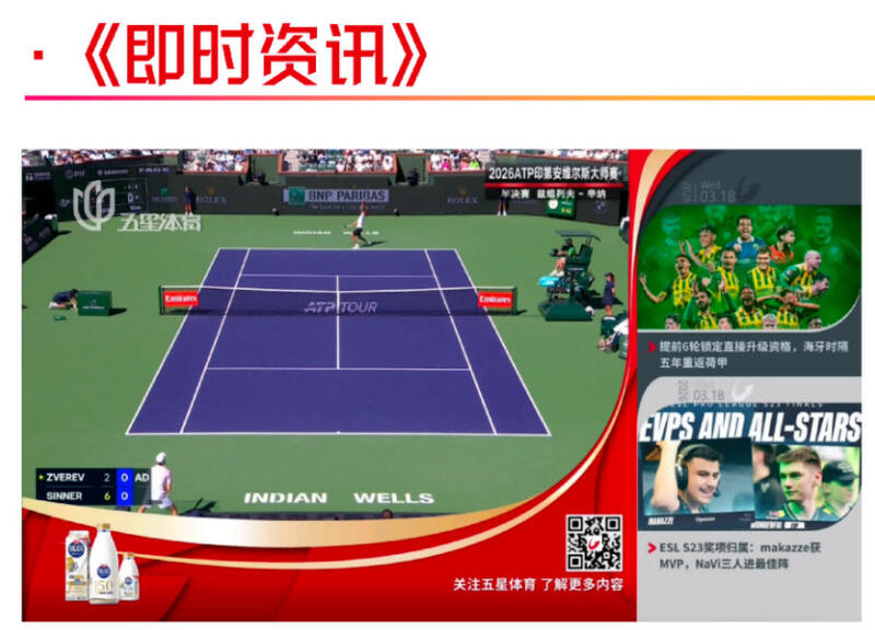 作为大屏创新的重要载体,五星体育频道此次《即时资讯》的常态化上线,进一步丰富了电视端内容供给,成为大屏提质的重要实践。