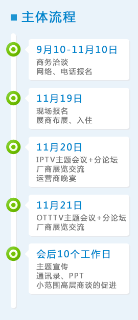 | 16:00 - 17:25 | 圆桌论坛: IPTV的智慧化步伐该如何走? 主持人:流媒体网灯少 工信部互动媒体产业联盟 中国电信iTV增值运营中心 戈壁投资、深圳路通、凤凰网、搜狐 等 |