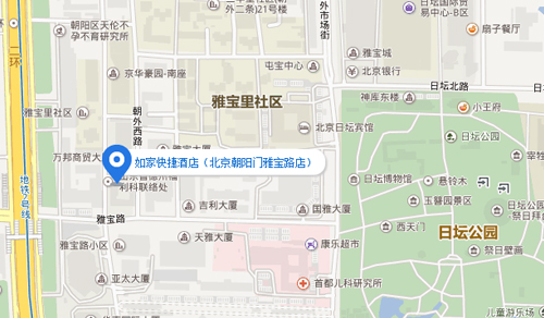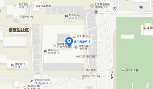 北京日坛宾馆 酒店地址:北京市朝阳区日坛路1号 ,近雅宝路。 酒店电话:010-85635588 距离(北京朝阳悠唐皇冠假日酒店)的直线距离为0.48公里