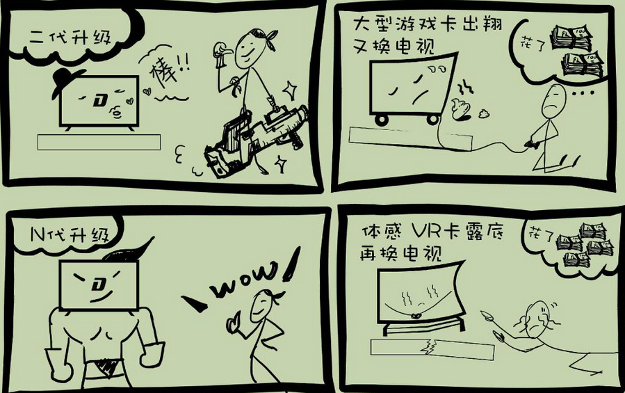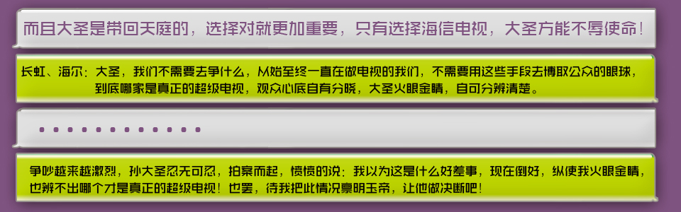 我说乐乐,你讲不讲个长幼有序啊?会走路了吗就学会抢着说话了?呵呵(讨好的表情)大圣,您休听他胡言乱语,没有超级宽带怎会有超级电视?我给您呈上一幅民间流行的漫画,就知道到底谁的才是超级电视了,哈哈