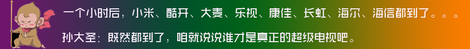 大圣,从我打算做电视的那一刻起,就立志要做人间最好的超级电视,我们围绕整个生态链展开,这岂是其他人所能比的!来自全球的人排队去参观呢!我们超级电视是四核1.7G,两G内存、全球唯一十代线面板,全视频化LetvUI系统,完整乐视生态,富士康制造,世界级品质,两倍性能,一半价格!让最极速的60寸四核智能大屏成为天庭的标配吧!