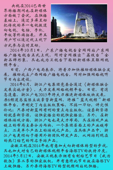 2014年8月25日,湖南卫视表示,2015年,其和芒果TV共同出资10亿元投入自制剧、定制剧拍摄,打造“双独播”概念。之后还会继续引入外部资金。另外,芒果TV还将全面启动独播战略,全网独播湖南卫视所有最强IP内容。