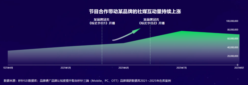 秒针SEI赞助评估数据库综合2021~2025年在库案例数据后发现,品牌在赞助某热门综艺和剧目后,品牌在社媒平台的声量和互动量会随着节目/剧目播出而持续攀升。