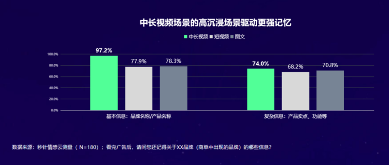 秒针情感云数据显示,相比短视频和图文,中长视频能更好的驱动记忆,另外据爱奇艺数据,在创意互动的加持下,中长视频能将CTR点击率提升1-2倍。