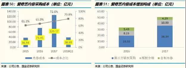 视频网站不断加大版权内容,尤其是第三方内容版权采购。近三年爱奇艺内容采购成本飞速上升,2017年达到126.2亿元,同比增长67.3%,占到其总成本的72.6%。2018Q1,爱奇艺内容采购成本达38.69亿元,占到其总成本的79.8%,同比增长54%,仍然保持了非常高的增速。另外,2017年内容成本增加的50.8亿中,第三方版权采购占到36.3亿元(占比约7成),自制内容占到4.3亿元(占比不到1成)。
