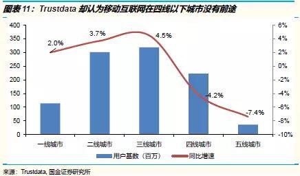 其实,无论根据哪一方的数据,都不能得出“小镇青年能驱动互联网行业新一轮增长”的结论。如果Trustdata是正确的,那么“小镇青年”这个群体可能正在缩小甚至消亡;如果QuestMobile是正确的,三线及以下城市的移动互联网用户总量在过去12个月也只增长了约11%,增速比全国整体水平高5-6个百分点,但是还远远谈不上驱动下一轮增长。