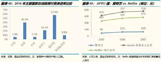 与发达国家相比,我国在线视频付费渗透率和ARPU值仍有很大增长空间。2016年我国在线视频付费渗透率仅为5.4%,而美国达到40%,2017年如果按照1.7亿的视频付费用户计算(用户不去重,中国网络试听节目服务协会预测数据),付费渗透率也仅为12.1%,仍有很大的发展空间。另外,2017年Netflix海外会员的ARPU值为573元,本土会员为759元,同期爱奇艺的付费会员ARPU值仅为129元,差距仍然十分显著。