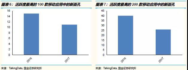 与此同时,用户留给新应用的空间也越来越小:2016年,全国活跃度最高的100款移动应用有15个新面孔,最高的200款应用有40个新面孔;2017年,这两个数字分别下降到11个、26个。再过1-2年,移动互联网用户或许会越来越习惯这种“强者恒强”的局面。