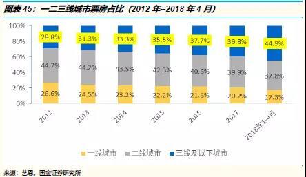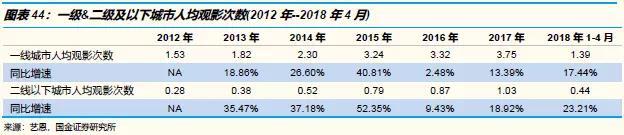 根据发达国家的数据,人均观影次数达到4次以后保持相对稳定。我国2017年人均观影人次仅为1.16次,如果仅统计城镇人口的人均观影次数也只有1.99次。根据2017年的数据,一线城市的人均观影次数达到3.75次,增速放缓,而二线及以下城市的人均观影次数只有1.03次,增速较高。随着渠道下沉,二级及以下城市的观影次数提升成为电影行业发展的长期逻辑。从2018年1-4月的最新数据来看,一线城市的票房占比逐步降低至17.3%,三线及以下城市的占比提升至44.9%。我们判断到2021年,城镇人口的人均观影次数有望达到3.2次,总票房有望达到1050亿元。
