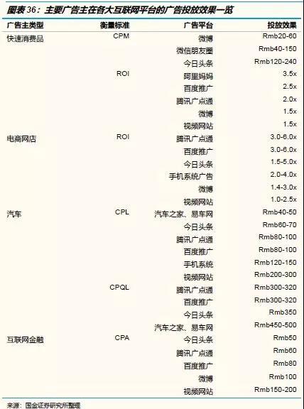 腾讯广点通的转化率非常高,甚至与搜索引擎推广处于同一量级。我们认为,这体现了腾讯通过社交应用获得的高质量数据。百度推广的转化率很高,这也是很正常的:搜索引擎的广告推送是基于用户主动输入的关键词。由于搜索引擎地位的下降,百度推广未来很难有更大的发展,手机百度的改版标志着百度的重心从搜索广告转向信息流广告。但是,在百度首页上做信息流广告,用户体验很差,长期效果有待观察。