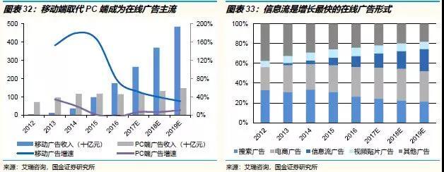 2012年以来,移动端广告维持着极高的复合增速,终于在2016年超过PC端广告,成为在线广告市场的主流。移动端广告的发展,带来两个趋势:第一是适合智能移动设备的信息流广告迅速增长,大有取代传统的搜索广告、图文广告、文字链广告之势;第二是基于大数据的精准营销越来越受到广告主的青睐,因为移动设备与个人用户绑定,非常适合进行精准投放。在这两个趋势的共同作用下,传统的广告霸主百度面临持续威胁,而微博、今日头条、腾讯广点通等信息流广告平台纷纷崛起。