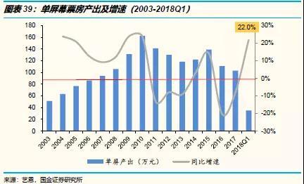 今年的银幕增速预计低于20%,票房增速预计超过20%,单屏产出有望触底回升。从上图可以看出自从2012年开始,银幕增速逐步放缓,2017年的银幕增速为23.3%,2018年3月底的银幕增速降为22%。电影票房中的银幕增速与商业地产建设周期有比较密切的联系,2017年商业地产的投资增速在近十年首次出现了负增长,我们判断未来几年银幕增速会进一步放缓,2018年的银幕增速预计低于20%。今年1-4月累计实现票房约226亿(不含服务费),同比增长24.2%,我们判断全年票房的增速有望超过20%,从而使得单屏产出触底回升。