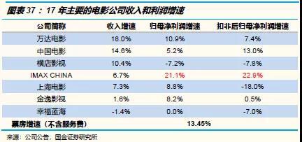 对于电影行业来说,大部分的投资人关心的都是院线行业:业绩稳定性强,不受单个电影票房的波动,跟随电影大盘的走势。然而,虽然过去几年票房保持高增长,院线行业的股价表现却平平,主要原因在于业绩低于预期。举例来说,2017年票房增长13.45%,但是院线行业公司业绩平平,龙头公司万达电影的利润增速只有10.9%,上海电影的利润增速只有8.8%,金逸影视的利润增速只有8.2%,中国电影的利润增速只有5.2%,横店影视的业绩反而下滑了7%,反而是非院线属性的IMAX CHINA的利润增速高达21%。而之前市场对于院线行业17年的业绩预期普遍都在20%以上。