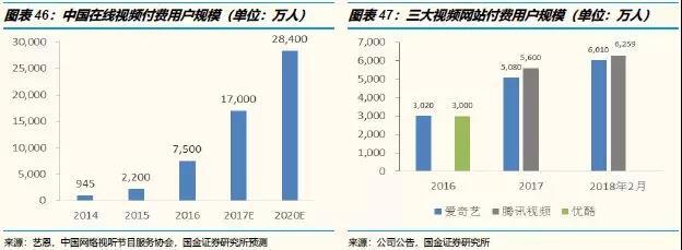 随着版权保护的加强、观众付费习惯的养成、精品剧数量的增加,在线视频付费用户规模迅速增长。2017年,爱奇艺和腾讯视频的付费用户增加到5080万和5600万,2018年2月则分长到了6010万和6259万。我们预计到2020年中国在线视频付费用户将达到2.84亿人,预测步骤如下: