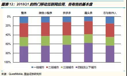 微信小程序在三线、四线以下城市的用户比例,分别比移动互联网整体水平高出约1个百分点;拼多多在三线城市的用户与整体水平相当,在四线以下城市的用户比整体水平高3个百分点;趣头条在三线城市的用户比整体水平低1个百分点,在四线以下城市的用户比整体水平高7个百分点;恋与制作人在三四线以下城市的用户比整体水平没有明显差别。