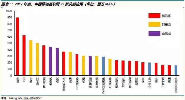 腾讯系:拥有微信、QQ、腾讯视频、QQ浏览器、酷狗音乐、QQ音乐、腾讯新闻、应用宝、王者荣耀等9款头部应用,战略投资搜狗输入法、京东、快手、美团等4款头部应用。用户黏性非常强,占据了中国移动互联网用户70%以上的使用时间。在社交、游戏、长视频、音乐、新闻资讯和应用分发等领域都处于垄断或寡头地位。2017年上线的“微信小程序”进一步加强了腾讯生态系统的深度和应用范围。