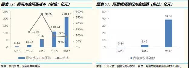腾讯公布的网络授权内容采购成本包括音乐版权和视频内容的采购,但可以预见,视频内容的采购成本占大头。腾讯内容采购的成本达到上百亿,并在过去2年保持每年翻倍的增速。阿里版权内容采购成本的会计记账比较复杂,既有直接进入成本,又有分期摊销的。阿里2017 财年视频版权摊销达到38.86亿元,约是16财年的10倍。根据媒体训练营的报道,2018年为了占据更多市场,优酷和腾讯视频分别作出了亏损80亿元的预算,爱奇艺为30亿元,如果该消息属实,3家一共将补贴190亿给内容版权的采购,而2017年电视剧版权市场的总规模为458亿元。