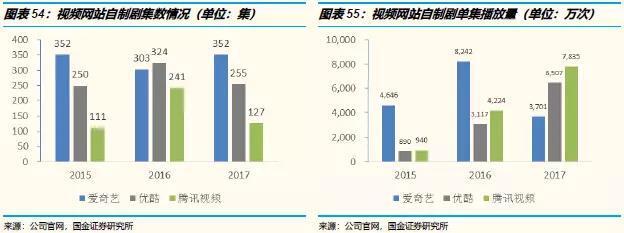 部分投资者担心,近年来视频网站自制剧越来越多,可能会对电视剧的采购产生不利影响。我们认为,这种担心在相当长一段时间没有必要。2017年,优酷和腾讯视频自制剧的集数都在减少。爱奇艺自制剧虽然集数增加,但换来的是单集播放量的大幅下降。视频网站自制剧与电视剧公司的精品剧还存在较大差距,对电视剧公司的影响较小。