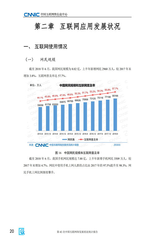 【流媒体网】摘要:8月20日,中国互联网络信息中心(CNNIC)在京发布第42次《中国互联网络发展状况统计报告》。截至2018年6月30日,我国网民规模达8.02亿,互联网普及率为57.7%。以下是PPT内容: