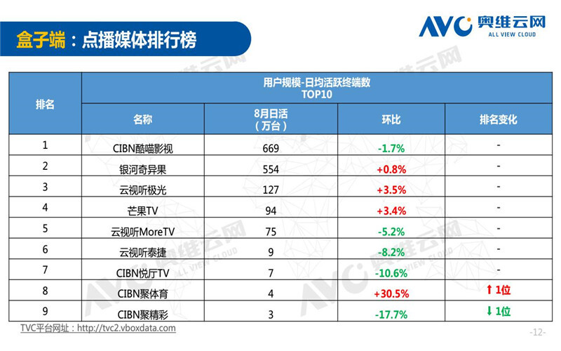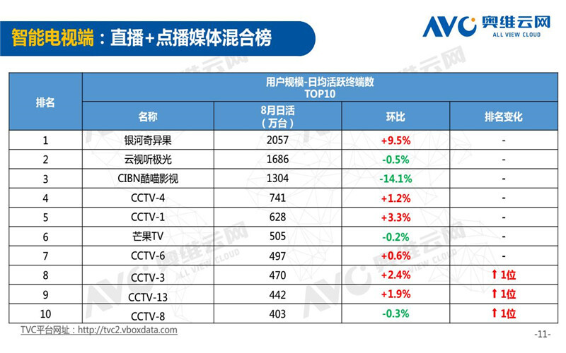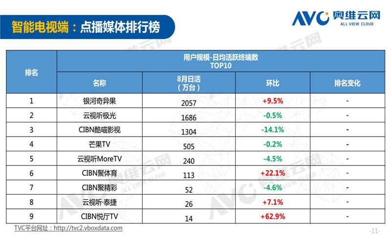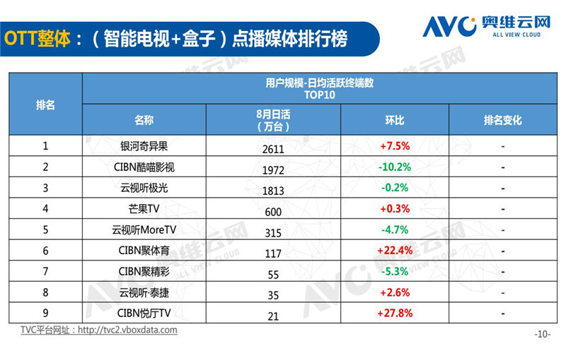 智能电视表现明显好于OTT盒子,与7月相比,OTT整体在开机率和日活终端上均出现小幅下降。